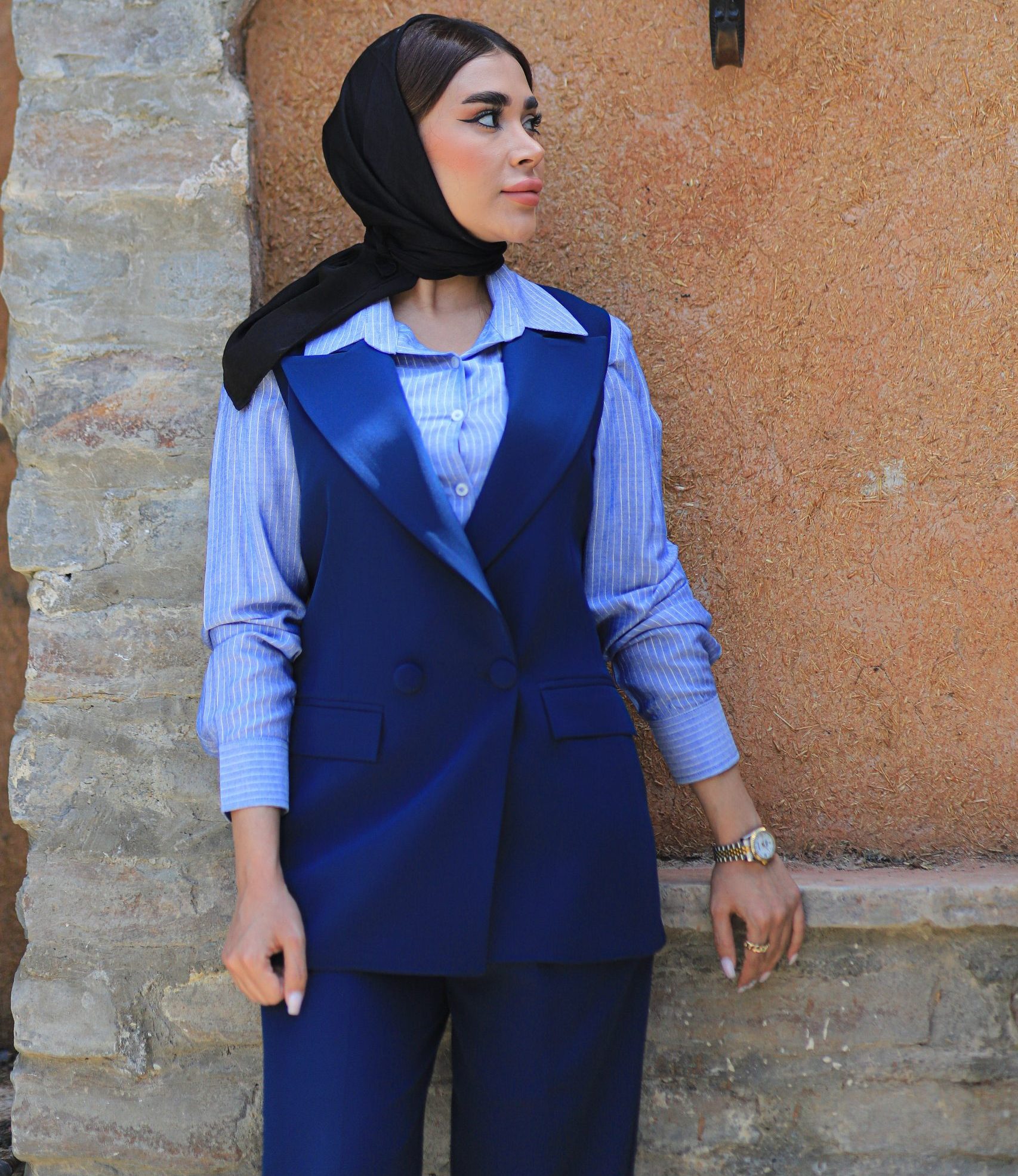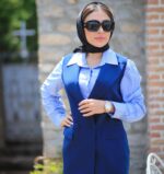 برای داشتن ظاهری شیک و امروزی، این وست و شلوار را می توانید با بوت های ساق بلند مشکی و یک شومیز آبی رنگ ست کنید. همچنین می توانید از نیم بوت نیز برای استایلی متفاوت استفاده نمایید.