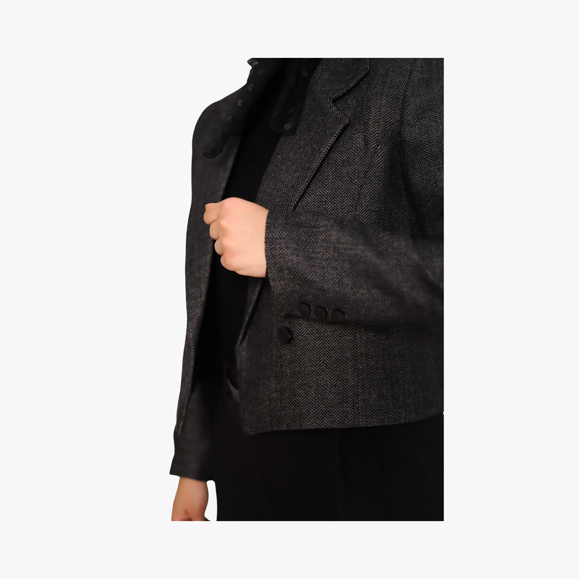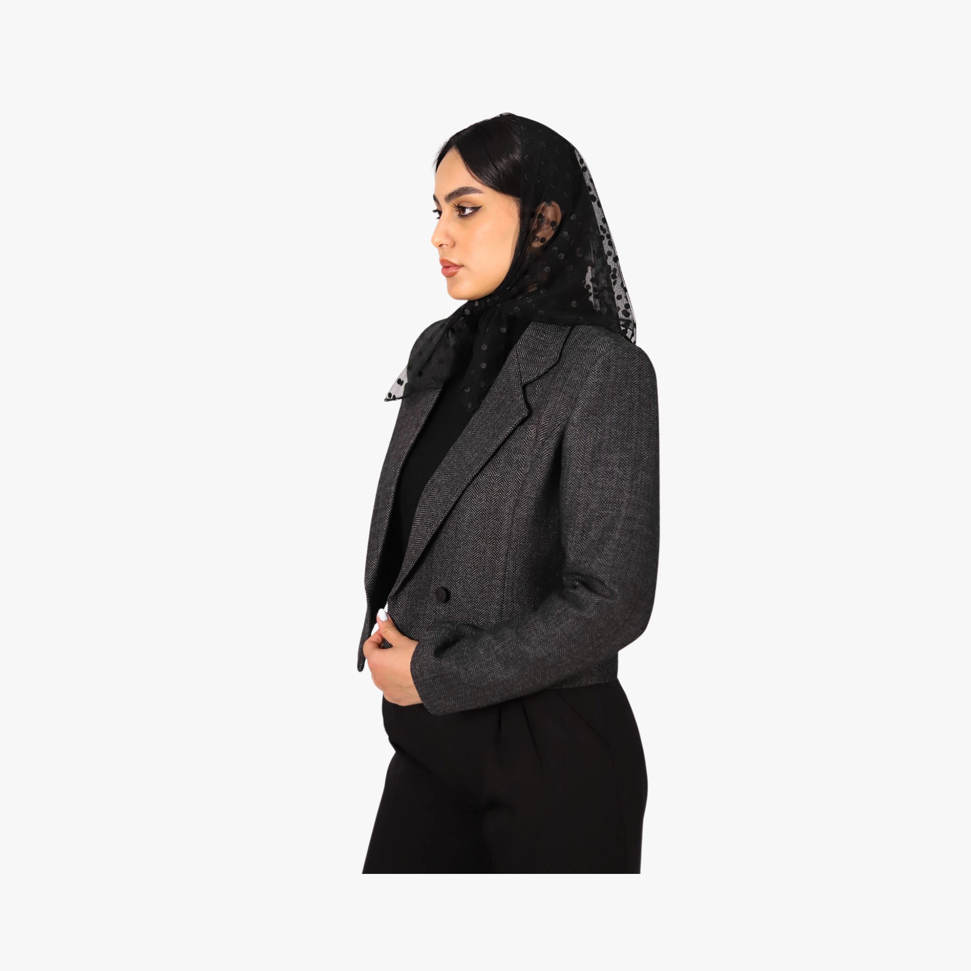 با کراپ کت جناقی شیک و زیبا، استایلی لوکس و چشمگیر را در کمد لباس خود بگنجانید. این کت خیره کننده با با پارچه مشکی رنگ و طرح زیبا و باکیفیت ظاهری مجلل و کلاسیک برای شما به ارمغان می آورد. پارچه لطیف و نرم آن، راحتی را در تمام طول روز برایتان به ارمغان می آورد.